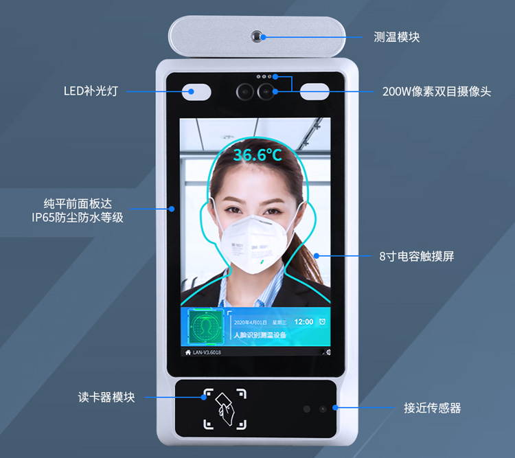 觸想智能8寸人臉識別測溫終端,采用人員識別、安全管理全新方案,整機采用高精度鋁合金壓鑄,人體工程學設計,搭載高清攝像頭,識別距離:0.3m-1m ,LED雙補光燈,可根據光線強弱自動調節,人臉捕捉清晰。采用國外進口測溫模塊,測溫精準。集成NFC讀卡器和接近傳感器,滿足刷卡識別和接近自動開啟,支持閘機式安裝、壁掛安裝和桌面安裝。