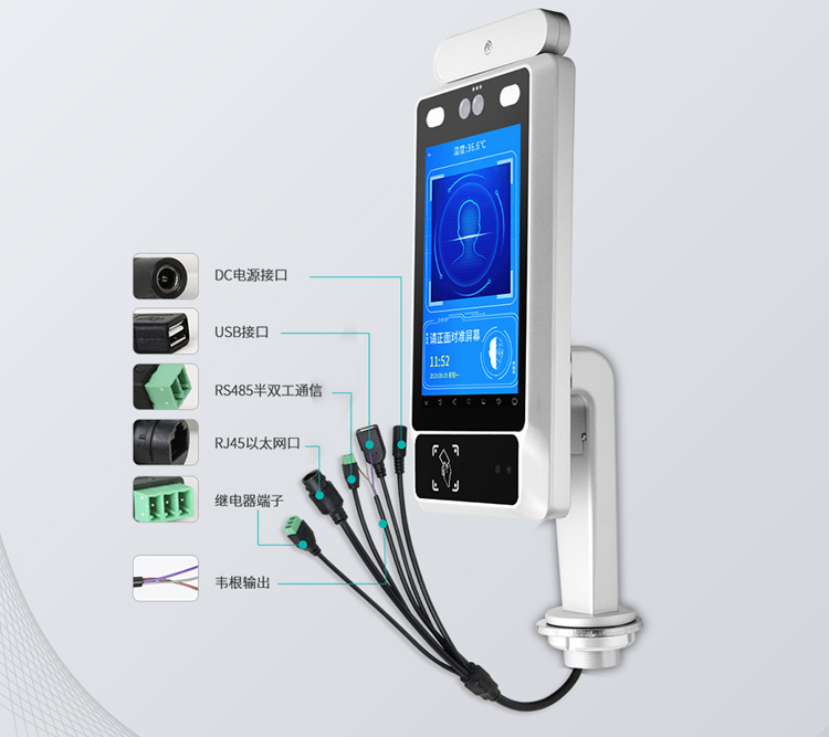8寸人臉識別測溫終端,融合人臉識別算法,在機器視覺、大數據和云計算等技術的加持下,能實現精準識別、無接觸式測溫,滿足人員出入身份核驗、行程記錄、體溫監測等工作需要,且可以7X24小時不間斷運行,體溫異常觸發警報。