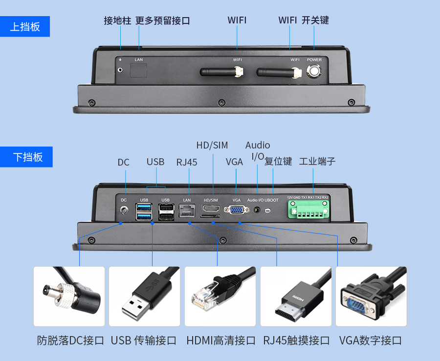 五代工業(yè)一體機(jī)接口分布在上下?lián)醢逦恢茫蠐醢澹航拥刂㈩A(yù)留接口、WIFI*2、開機(jī)鍵;下?lián)醢澹篋C、USB*4、RJ45、HD/SIM、VGA、AudioI/O、12V GND TX1 TX2 RX2 AB|1 01 02 03,接口豐富,應(yīng)用場景多樣。