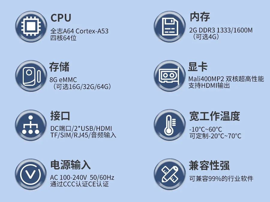 標配全志A64Cortex-A53四核64位處理器,2G DDR3 8G eMMC 搭配Android6.0系統,支持本地SD、USB升級。