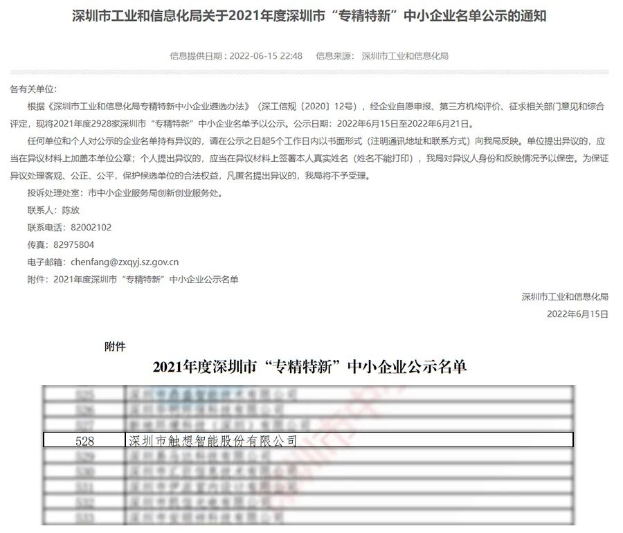 日前,深圳市工業和信息化局公布了《2021年度深圳市“專精特新”中小企業名單》,經三方機構評價,征求相關部門意見和綜合評定,觸想智能憑借在智能制造領域多年耕耘與不斷創新,在一眾申報企業中脫穎而出,獲得深圳市2021年度“專精特新”企業榮譽稱號。