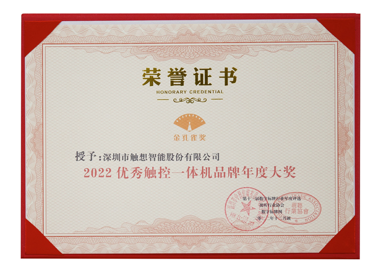 大會同期頒發了數字標牌行業最高榮譽“金孔雀獎“,經過近三個月、數百家優秀企業的激烈角逐,觸想智能憑借在創新引領,產品美譽、市場認同方面的卓越表現,實力斬獲金孔雀獎——2022優秀觸控一體機品牌年度大獎。